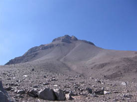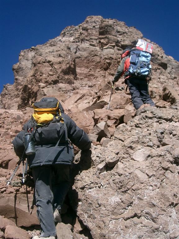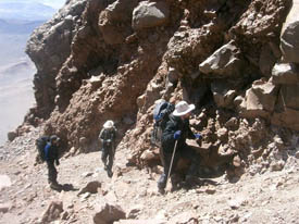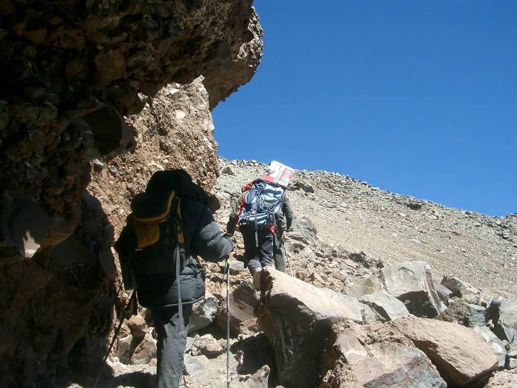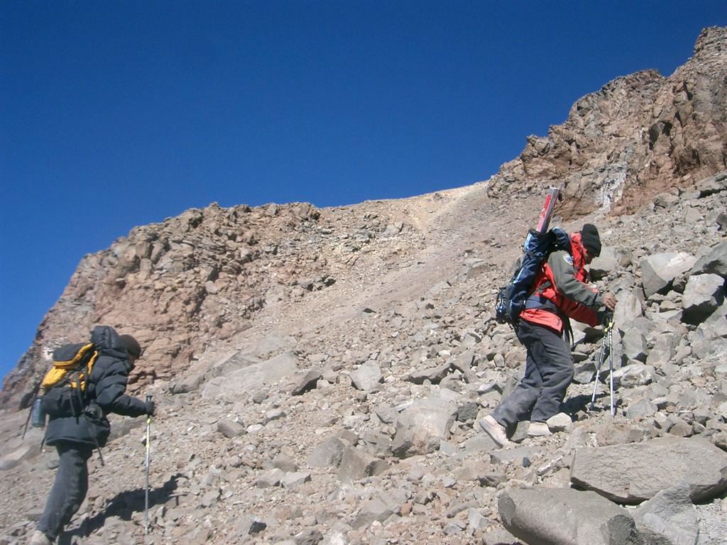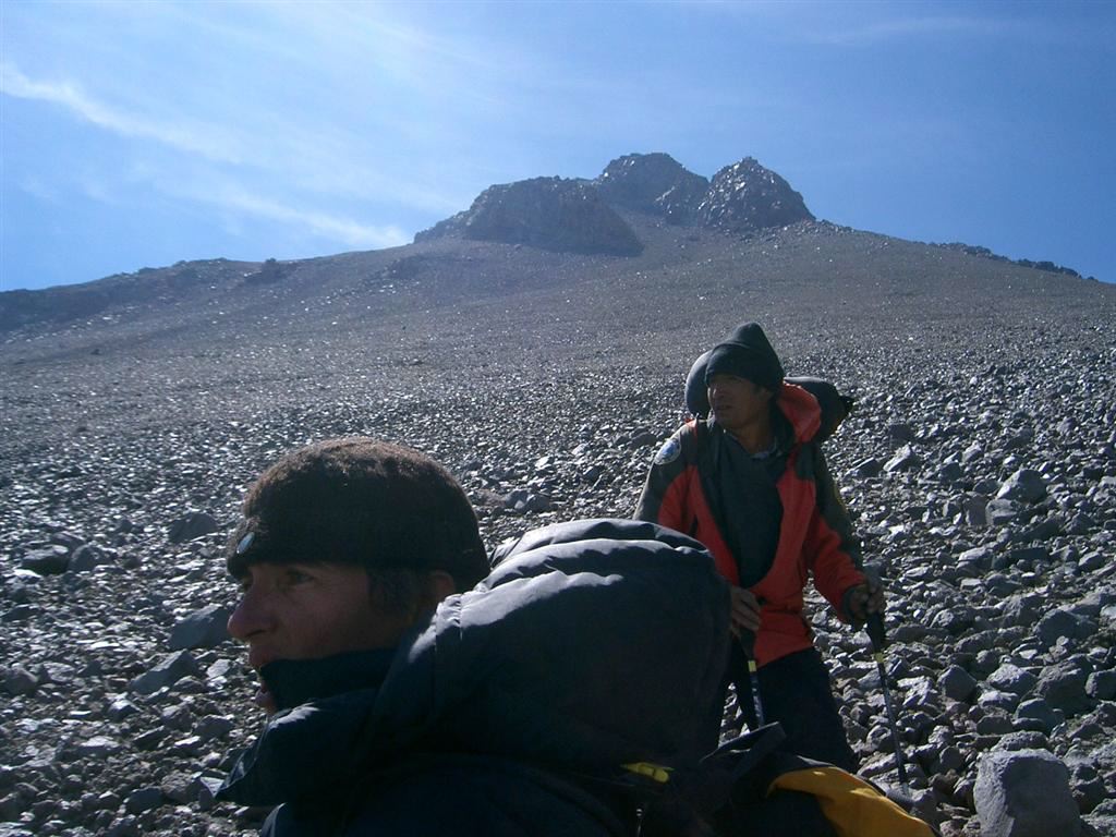 Macario and Victor went on a reconnaissance two days before and the news were interesting. Basically, to start with, a 45 degree scree, sand and gravel slope for 500 m and the last 600 m in huge blocks. They were right... There is no trail, we will have to make it as we go...Starting at 4,800 m, we try to contour the problem by going up through a little gully. There, we encounter more rocks but, with that kind of slope, they are not necessarily stable. We have to watch every single step we take. But up we go.