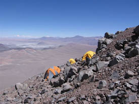 We continue up. Half-an-hour later, we arrive to...mid-camp or, this is what Macario calls that place. There are a few high-blocks that are of almost no protection against the very high-wind that has been blowing all afternoon. Most interesting of all, I can see only two little 4 m x 3 m flats on that 45 degree slope. Those "terraces" are just the size of two tents and perched on a few large blocks, the second terrace being just below the first one. They were built by the porters. Well, better not to have to get out during the night...Licancabur's mid-camp now looks in my memory like a four-star hotel. This is insane. My look must be incredulous because Cristian looks at me with a half-smile. What we do not know yet is that we will be stranded on that condor nest for the next 36 hours...