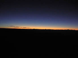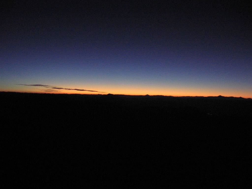 By 6:00 pm, I am in the tent. The wind is up. I believe it is the sunset wind that usually subsides after sunset. I am wrong. Instead of calming, it will pick up, at some point threatening to blow the tent away. That's a good thing I am inside with some equipment. The tent goes from one side to the other in some cases. Nonetheless, I fall asleep. Everytime I wake up, the wind is here, as strong as before, still there at 3:00 am. This is when I seriously think about descending the next morning. A wind of that speed would be dangerous during the climb. I can live without climbing Aguas Calientes this year. We have incredible results with the other climbs already. And then,around 4:00 am, it all calms down.The porters are the first out of their tent at 6:00 am. I am right behind. The sunrise is amazing: Deep night blues are followed by white yellows and soon after bright oranges...The sun is up announcing what will become a day like none before for us, a wonderful day, filled with joy and achievement, filled with the pride of having overcome the hardship of a nightmarish ascent, a wonderful day indeed,a wonderful nightmare just about to start...