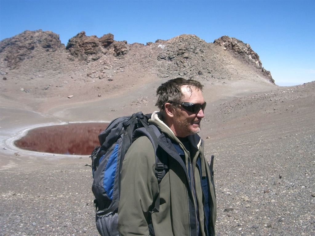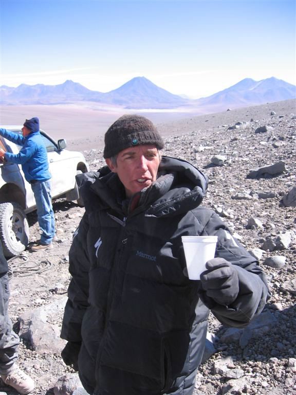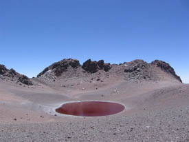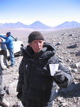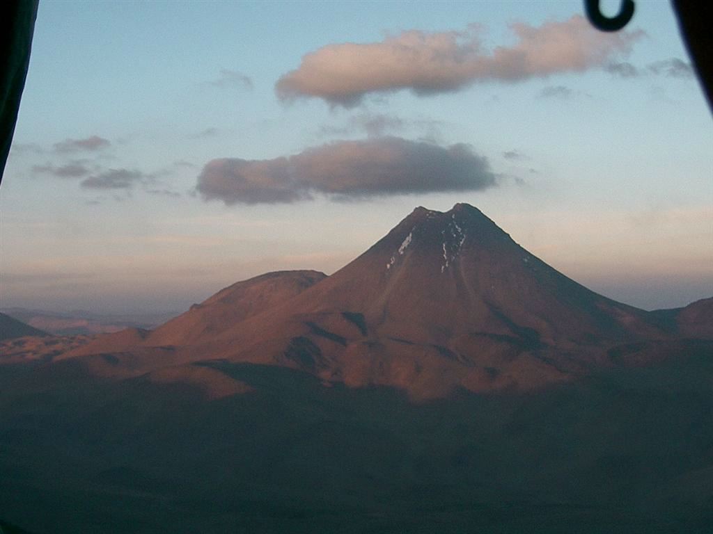 Aguas Calientes is located in the Chilean altiplano. We GPSed its summit at 5,930 m +/- 10 m.It is right next to Pili (or Acamarachi, which is the Inca name for the same mountain). The landscape takes you right away to Mars 3.7 billion years ago...Volcanoes everywhere, hummocky terrain, lava flows, evaporating lakes. To add to the surrealistic impression, Aguas Calientes is contiguous to Lascar, the most active and ill-tempered volcano of the chain. Lascar blows its top regularly every 7 years, the last major eruption having occurred in 2001. However, last january, there was another significant eruption and the volcano is still smoking...Nice neighbor to have...but frankly very cool for a geologist. I was just praying that Lascar could hold it for a couple more days while we were there but would still continue to throw water vapor in the air for the spectacle.Yes, cool, very cool, maybe in a very sick way but, once again, I am a geologist...