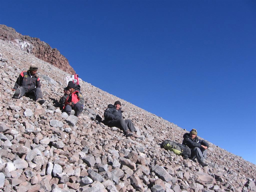 "Mid-camp" is at 5,370 m. We build our tents making sure not to fall off the terraces at every step we take. Not much room to move around. Soon the stoves are out. Cristian, Matthieu, and Victor are sharing one tent. I am sharing mine with Eric. We are the closest to the big blocks, some of them not looking so stable to me but hey, it is not that we have the choice. Just like for Lascar, I am hoping that this mound of rocks will stay together for a little while more... From the corner of my eyes, I see the porters now building their own terrace to put their tent. Jaime has explained his disappearance...He took a parallel gully to ours. I am not too happy because first he did not tell the other porters or us, and second, he did not have a radio with him. I have two words with Macario as well because he is supposed to be in charge of these guys...At least, there is a rationale explanation for Jaime's disappearance.