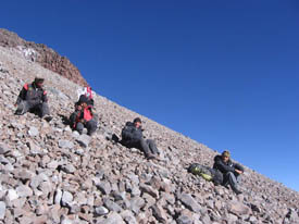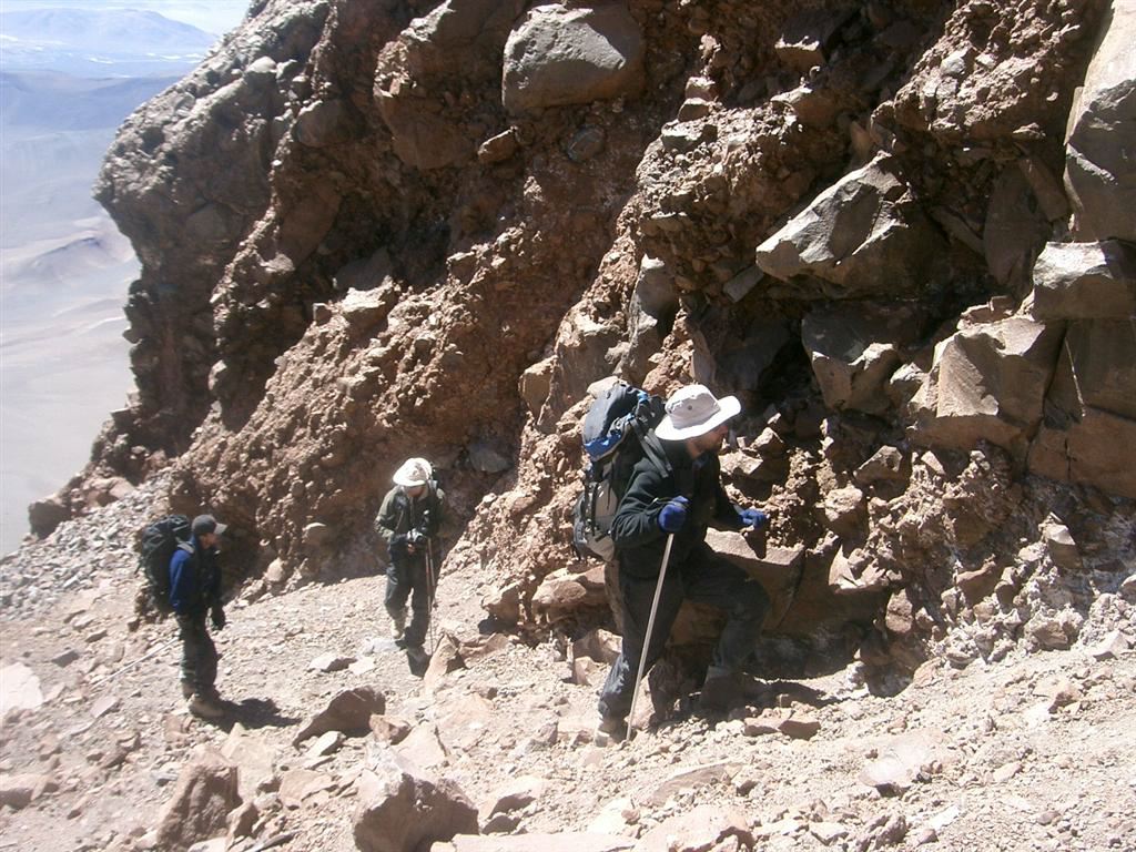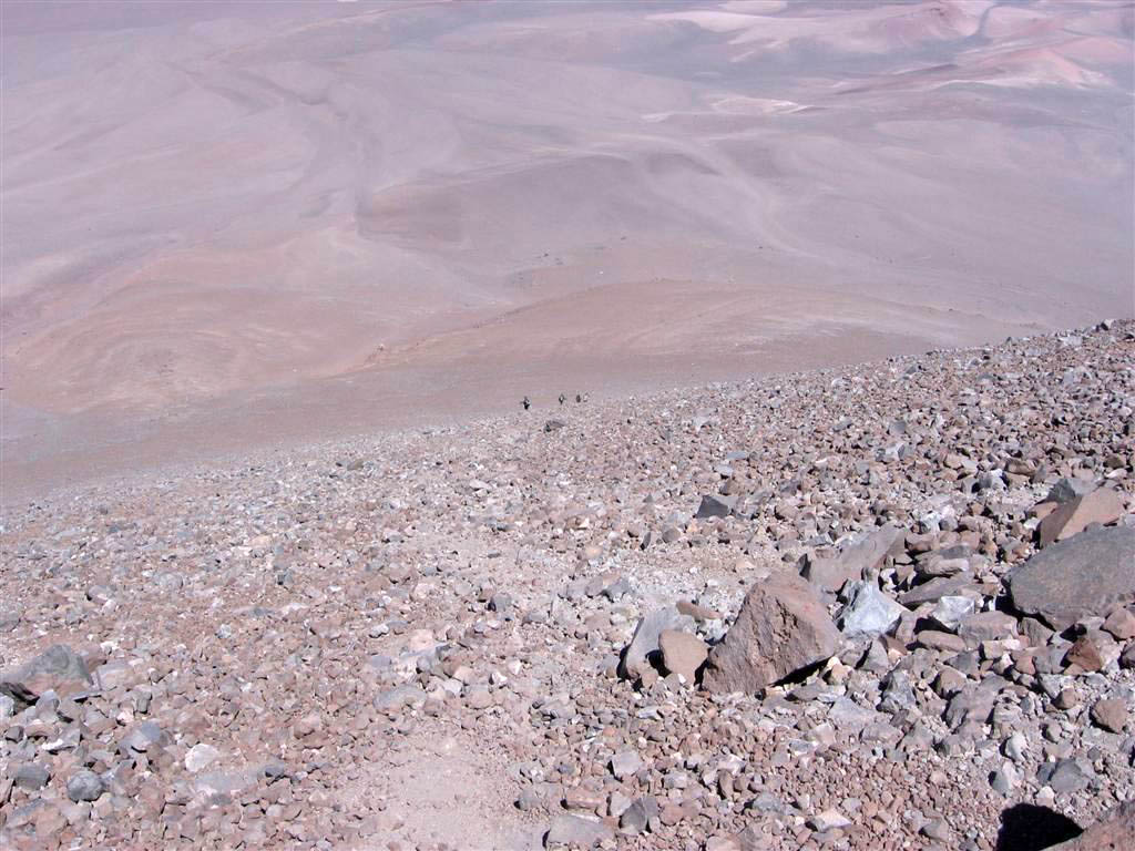 We are on for another good one of the day right there. It is absolutely out of the question to descend by the same route we came. No, instead we will take the central gully, as we do on Licancabur. There is a slight difference though...To see the floor of the gully from the rim, we have to really look down at our feet. The slope is so steep, it looks almost vertical...Macario goes ahead. The good news is that the material is pure sand and scree...The bad news is that this is nothing to hold a slope in place, especially with that kind of gradient. As a result, for almost every step we take, half the volcano comes down with us. Still, descending in this type of material is comfortable. We have to be careful about possible rocks hiding underneath the sand as they can make us trip. We descend fast. I am behind Macario and Matthieu is behind me. Eric, Cristian, Victor and Martin are a little behind but together. In one hour, the first three of us make it back to mid-camp, now empty, since the two other porters, Jaime and Barnabe who stayed behind broke camp and descended with all the equipment this morning.We sit there about 10 minutes. The second group is sitting a little higher in the slope but we can see them clearly and can communicate with them by radio.