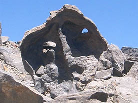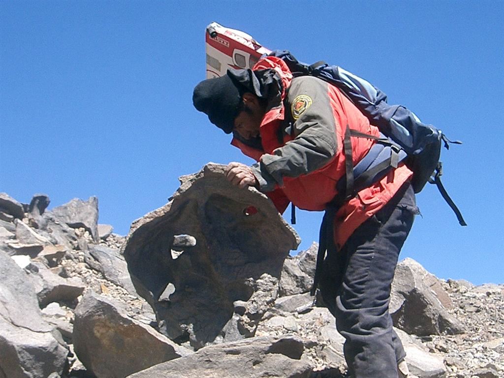 Macario continues to pave the way for us, finding an invisible path in the middle of the rocky chaos of these last 100 meters. A last switchback passing underneath the overhanging rocks; a tiny and frozen cascade to our left and to our right, the summit rim. Am I dreaming? No, this time it's here, really here. Before crossing the edge, Macario finds a tortured hollow lava block that looks very much like an Inca mask. He takes it and puts it upright. Somehow,I have the feeling that by doing this, Macario is materializing the spirit that seemed to have accompanied and tested us in the ascent, and possibly in the challenges of the previous two days. This is very appropriate...Now, the gate of the Aguas Calientes summit will be guarded by this mask.