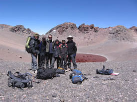 Everybody is on the summit rim now, inside the crater. I cannot help it, I take a few steps forward. I want to see that lake. I hope it is worth all what we left on the slope. Worth? I am speechless. In front of my eyes, another crown jewel unravels, a magnificent ruby, a gem in the heart of an unlikely jewel box. What a beauty...The lake is so red that depending on the angles we look at it, it turns sometimes purple. Still, after all we went through to get here, I have a "niak" moment, tighting my fingers into a fist. It was a battle to get up there, a fortress to conquer, but the mountain once again rewarded our effort. A jewel to discover, to explore, a magnificent jewel now offered to us. Of course, photos...Banners are out, smiles are on all faces. It is now time to get into the crater and to the shores of this lake. Let's get acquainted. But before, I am taking a GPS measurement of the altitude. Including the lava cliff, Aguas Calientes towers at 5,930 m. The lake is at 5,870 m.