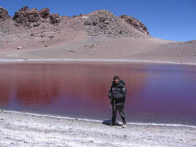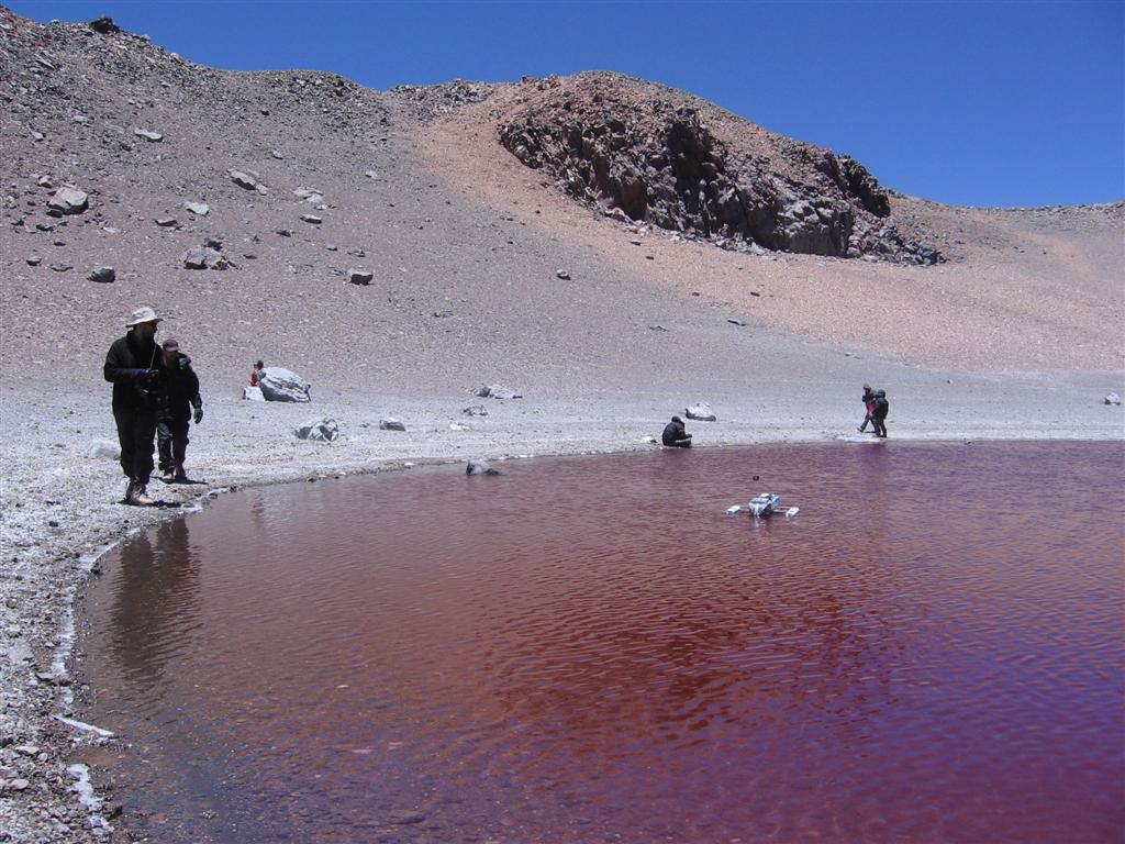 The red lake is about the size of that of Licancabur but rounder, almost looking like a red balloon. Its shores are circled by white deposits and the signs of a few ancient shorelines that are still marked on the ground. We all take some drink and food, much needed after such an effort and then we go to work. Matthieu disappears with Macario and Martin. They carry the Eldonet station. They will install it in a protected area. I take my poles and start walking around the lake, a first survey to see what is interesting and would be worth coming back to in a moment. Right away, some details are striking me: There is no life visible to the naked eye, conversely to Licancabur; There is no green algae, no algae at all for that matter. I continue. There is a small channel coming down from the rim. There is a little bit of ice still in it. I suppose that it is created seasonally by snow melt. That will be a place to come back to, especially the site where it connects with the lake.