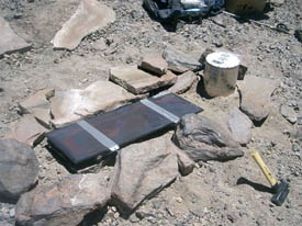 We resume our descent. We just have to be careful now because of fatigue, otherwise the terrain is much better going in that direction. Macario, Matthieu and myself reach the 4x4s where the drivers and two porters are waiting for us in one hour and forty minutes. Cristian, Eric, Victor and Martin will make it in two hours. What a day...Climbing 600 m from mid-camp to the summit rim in a little over 3 hours, accomplish all the science we could, and descend 1,100 m in two hours... We look back at Aguas Calientes with a lot of respect, with also a very deep feeling that the mountain is giving some back to us. The return to the refuge will be long, very long...We need to go through San Pedro to get to our bus, transfer the equipment, get through the Chilean customs and then up in the altiplano, once more but this time, we are going..."home". The journey ends the same way it started. After one of our 4x4s on the way up to Aguas Calientes, this is now the bus which is overheating. We climb at about 5-10 km/hr. If I was not so tired, I would jump and continue on foot!